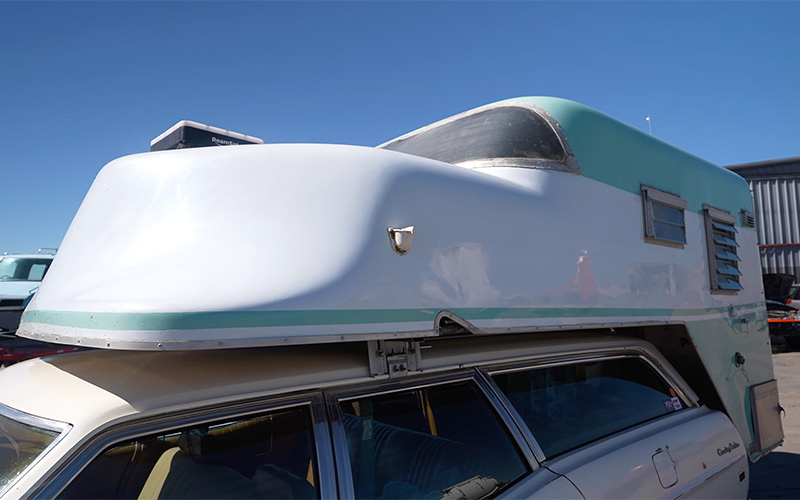 ToteMotel, Inc., a division of Fiberglass Fabricators based in Phoenix, Arizona, built these campers in the mid-1960s. The camper is fastened to the roof rack, drip rails, and tailgate of the station wagon—yes, you read that correctly.