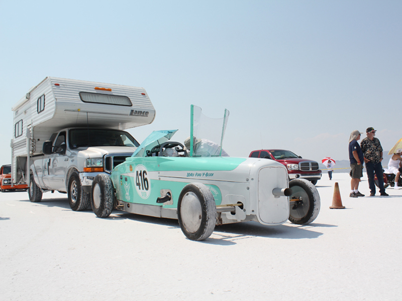 The picture of my camper is at “the Bend in the Road” on the approach to the salt flats. I’m not taking my truck camper out on the salt. Fords have aluminum bodies, so I don’t want to take it out. I set up camp with our camper with the trailer. Then the red truck goes out to the pits where I set up. It can be as much as ten miles. When you enter the salt, it’s five miles to the pits.