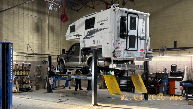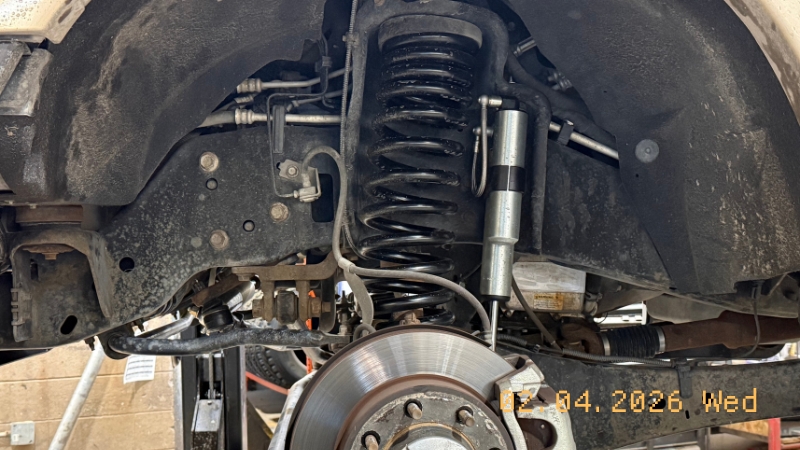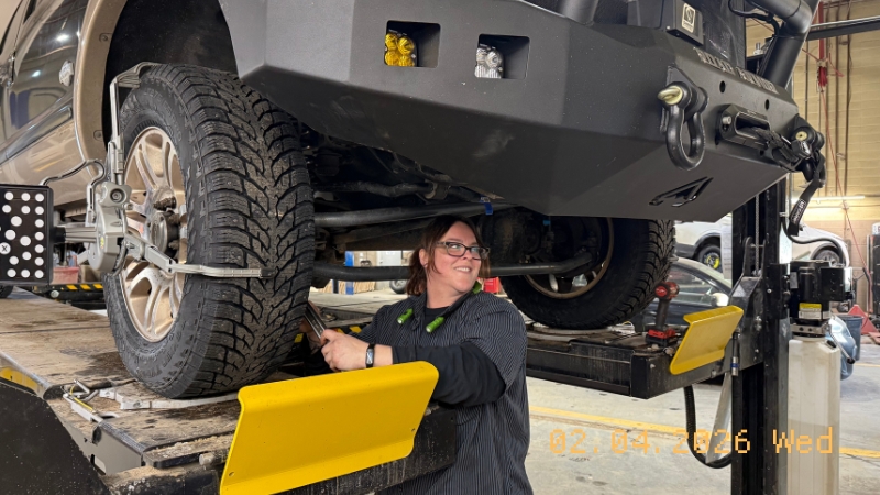 Before leaving town, the brothers stop at Kal Tire in Westlock to swap tires for Nokian Hakkapeliitta LT3s, a critical upgrade for the road ahead. The Kal Tire crew also dials in a front-end alignment, upgrades the OEM headlights to LEDs, adjusts the fog lights, checks fluids and brakes, and loads up chains.