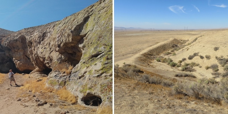 Paul: The name Fossil Falls simply intrigued us, so we planned a weekend visit. Fossil Falls Trail winds through a 20,000-year-old lava flow, where basalt rock was carved and polished by an ancient river, leaving behind a dry, sculpted stone waterfall.