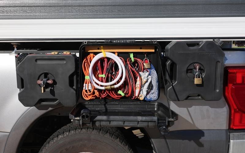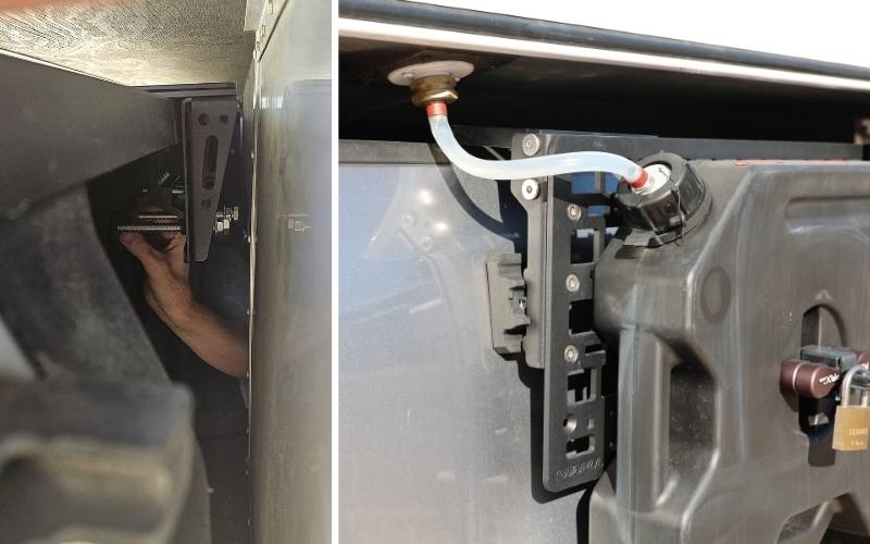 Paul: Our STAPLL setup consists of the 48×10” Fender Rack: two brackets connected by a 48-inch by 10-inch MOLLE panel mounted to the driver’s side truck bed. We attached two 1.75-gallon RotopaX containers for gray water collection and a hard case for gear storage. All of our wet stuff stays outside.