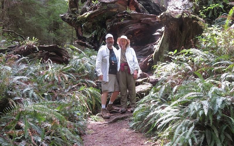 Donna and Paul hiking in Prairie Creek Redwoods State Park