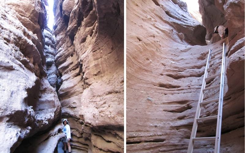 Donna: Ladder Canyon goes from a wide trail through Painted Canyon to a series of slot canyons with ladders to climb. Parts of the canyons were so narrow that we had to turn sideways to get through. The best way to hike the trail is clockwise, so that you go up the ladders rather than down.