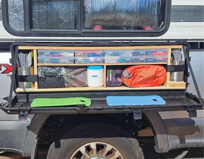 Donna: We keep our rig ready to roll. Our camping gear and supplies stay organized which cuts down on packing fatigue and gets us out the door more often. When we first got our FWC Hawk base, we incorporated storage using plastic drawer units framed with aluminum and plastic bins to keep our gear and food tidy.