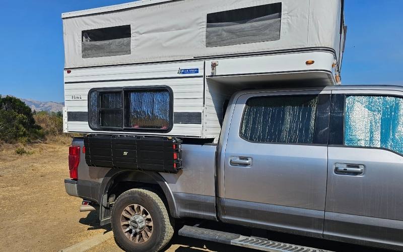 Paul: The truck cap worked great until it didn’t. Heavy rain revealed its limitations and soaked all of our gear and bedding. We realized we needed something fully sealed. After researching all of our options, we landed on the Hawk slide-in by Four Wheel Campers.