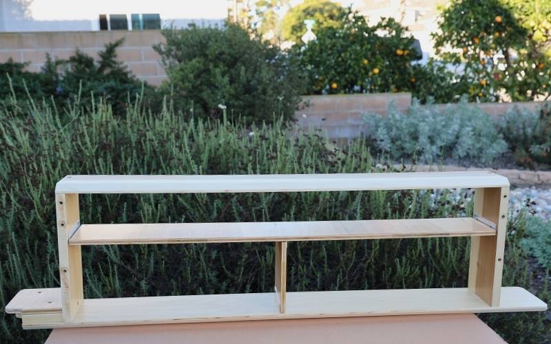 Donna: We built shelves inside the long case to hold small plastic boxes containing tools and repair supplies. Our tire snow cables are on either side of the shelves along with gloves and kneeling pads. In the lower left cubicle, there’s an air compressor, jumper cables, and bungee cords. The lower right cubicle holds a tow rope, shovel and axe.