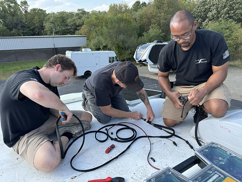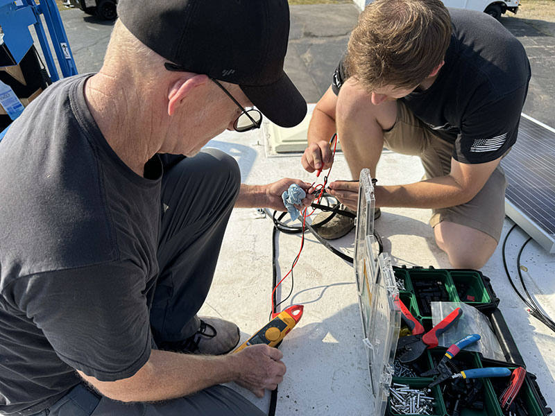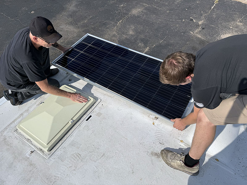 Once the two-panel decision was made, the FSI installation team made quick work of installing the panels, completing the wiring, checking the wiring with a volt meter, and routing and affixing the wiring on our roof with 3M VHB cable clips. These guys are pros.