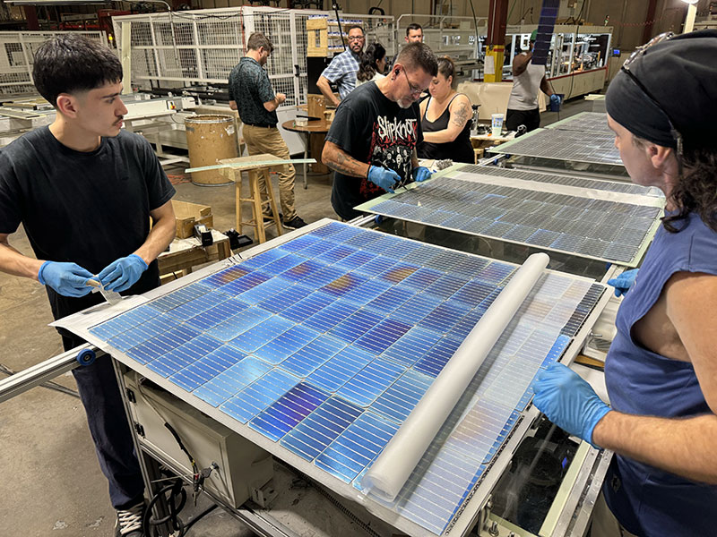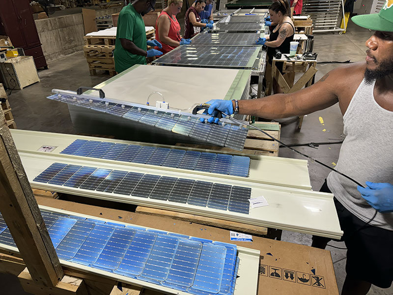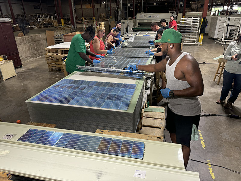Before our install, the FSI team took us to Crossroads Solar to see how their bifacial solar panels are manufactured. Before we arrived, they explained that Crossroads is a second-chance hiring facility that employs formerly incarcerated people. The company helps these individuals reintegrate into society, learn valuable new skills, and earn a living.