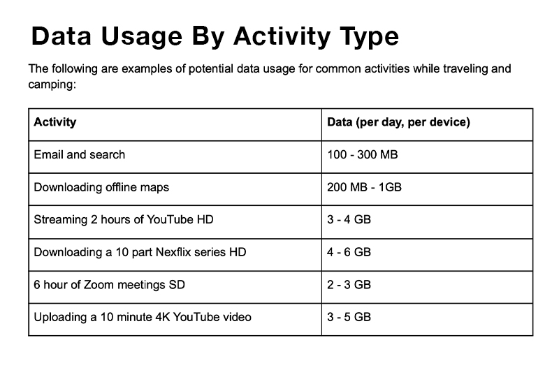 The Roam 100GB offers 100 gigabytes of full-speed upload and download internet use. Once you reach 100GB, your internet is throttled to very low speeds. Roam Unlimited is truly unlimited full-speed internet without any throttling or limitations. I created a chart that shows data usage by activity type.