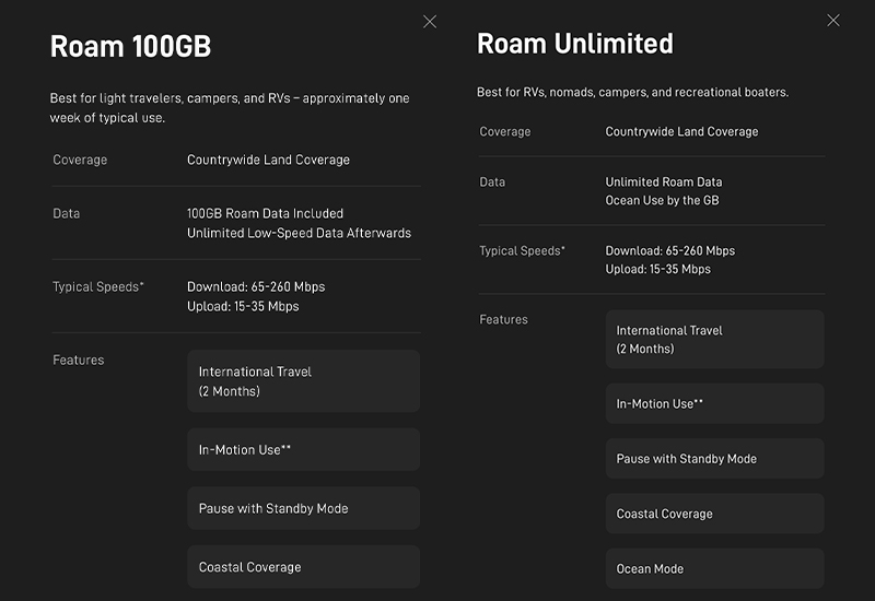Starlink offers two data plans: Roam 100GB for $50 and Roam Unlimited for $165. Both plans include countrywide coverage, in-motion use, two months of international travel, and coastal coverage up to twelve nautical miles off the coast.