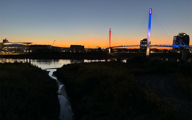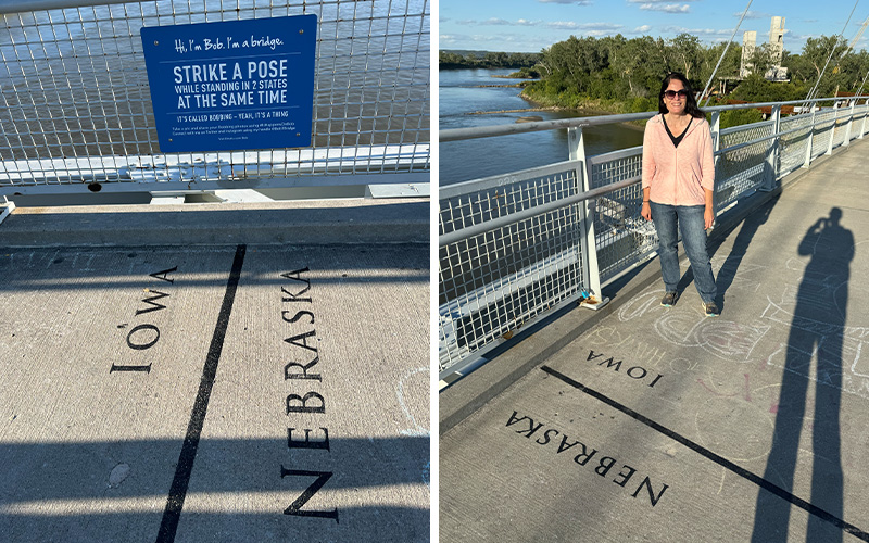 Just before dusk, we walked into Nebraska across the Bob Kerrey Pedestrian Bridge. Right in the middle of the bridge was a Nebraska/Iowa border marking on the ground. We had some fun with that, and then, we walked into a park on the other side of the bridge.