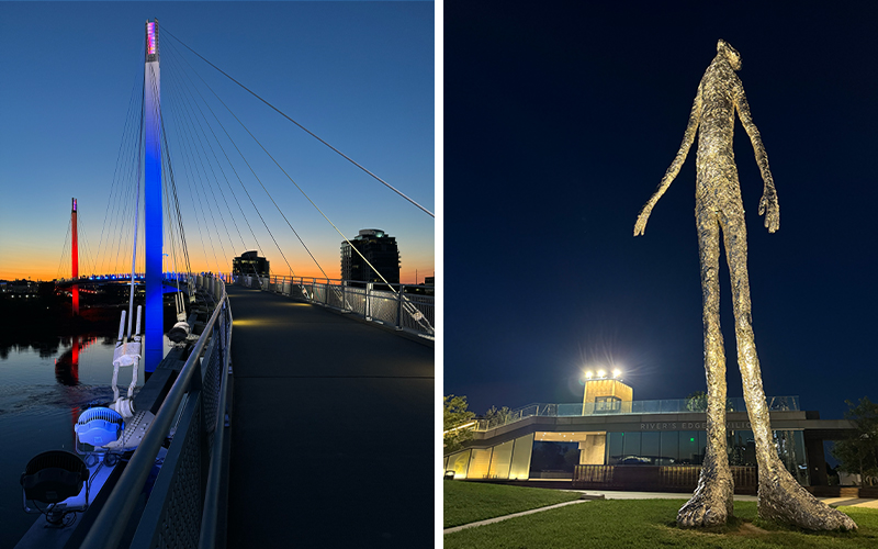 On our return walk to Cosmo and our camper, we did see the Bob Kerrey Pedestrian Bridge all lit up in blue and red and some cool sculptures in the Tom Hanafan River’s Edge Park all lit up. From our short time here, we did find that Omaha has a lot to offer. Sometimes an experience like this one makes me think of the places we might have missed because we were so stuck in our “not going to cities” mindset. We’ll be back, Omaha! Thank you, Matt and Molly, for the recommendation.