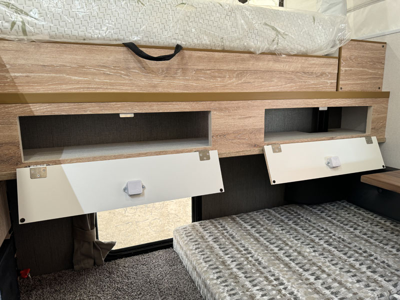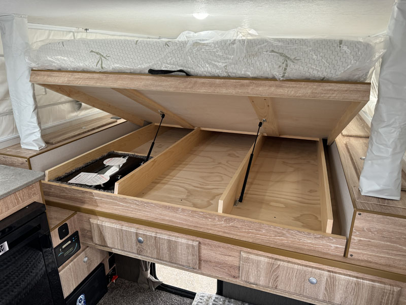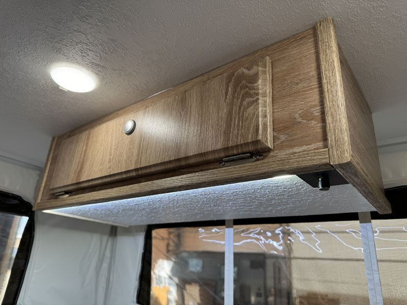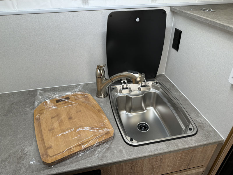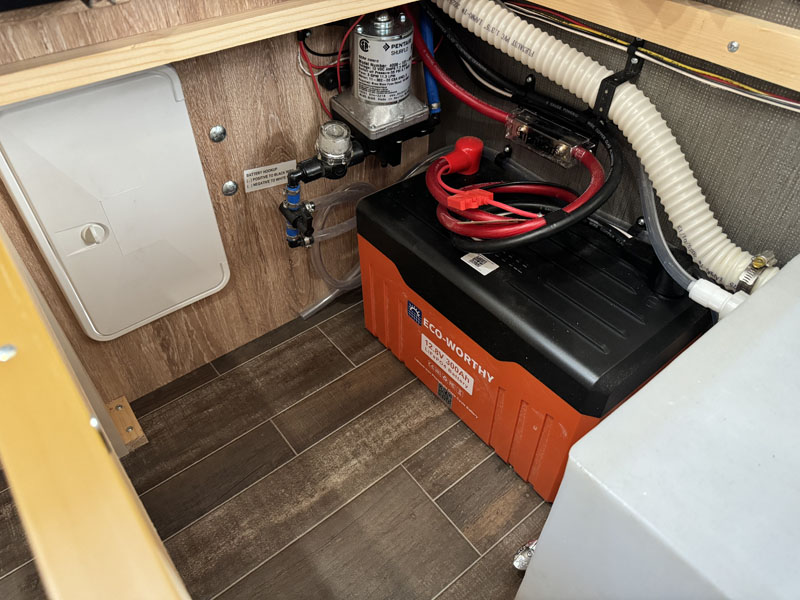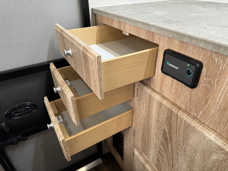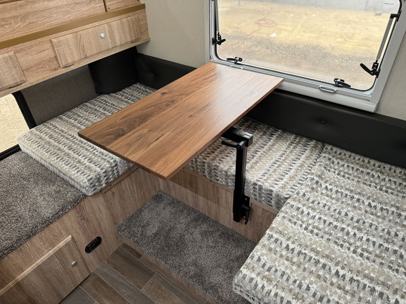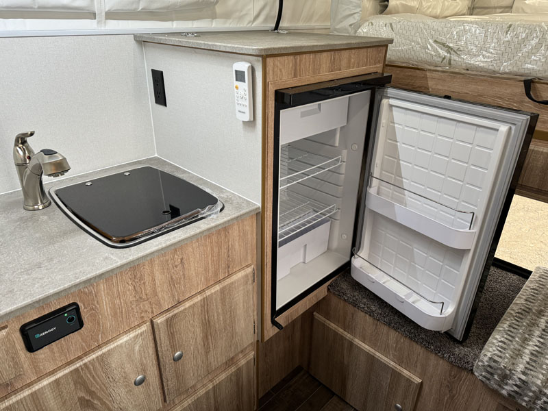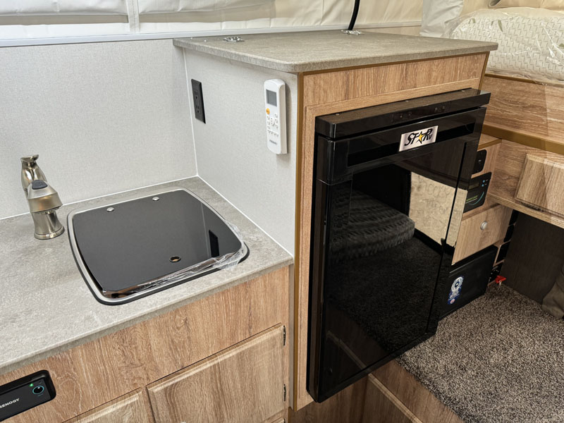 A 3.5-cubic-foot Star RV 12-volt compressor refrigerator, MaxxFan Plus, electric roof lift, LED lighting, and a full suite of 12-volt and 110-volt outlets complete the all-electric theme. Available options include electric jacks, a grey-water holding tank, exterior solar hookup, and awnings up to 10 feet long.