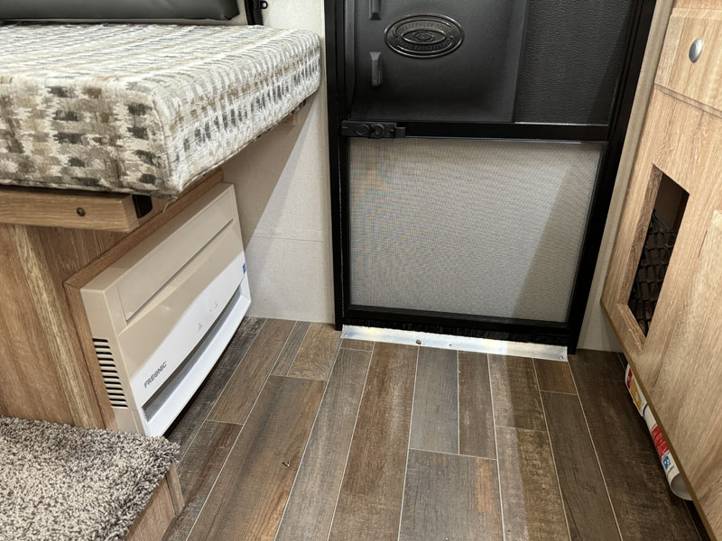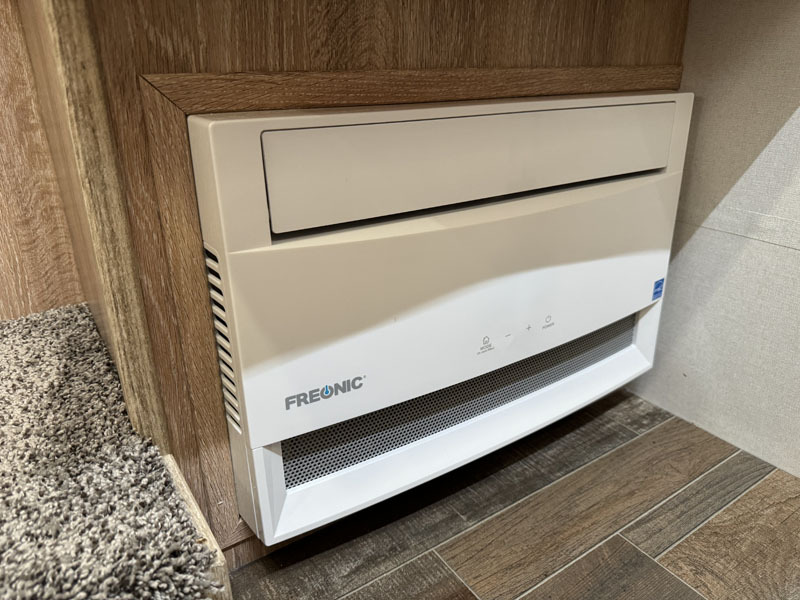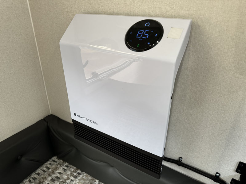 A Freo 6,000 BTU air conditioner and Heat Storm HS1000WX infrared heater manage climate control, while a portable electric cooktop replaces the traditional propane range.