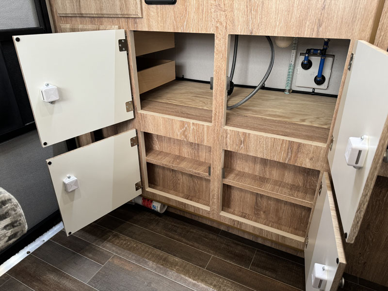 Inside, you’ll find a teak sink insert, aviation-style latches, a Lagun table system, and a Sure Sleep 6-inch gel/foam mattress.