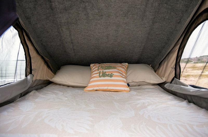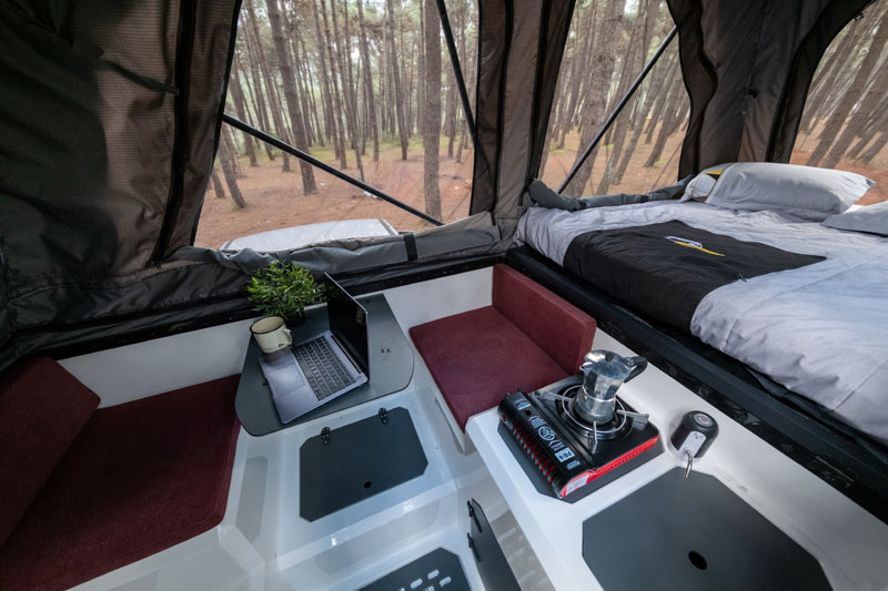 A roof top tent also gives owners the choice to sleep inside their hard side camper, or sleep on the roof with pop-up camper-like views and connection to the outdoors.