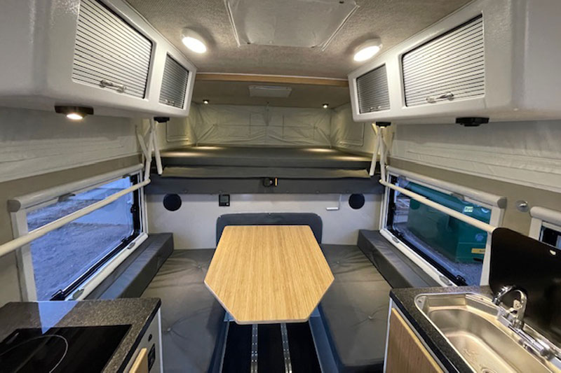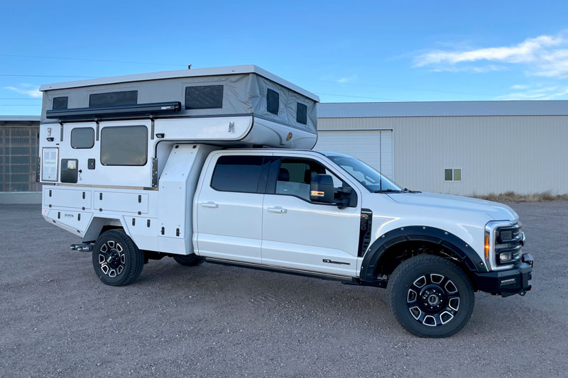 The electrical system includes 430 watts of solar, a 230Ah heated lithium battery with Bluetooth, a 2000-watt inverter, DC-to-DC truck charging, and shore power charging. Additional features include two 15-gallon fresh water tanks, Arctic Tern insulated windows, Hallmark’s Super Manual Roof Lift System, a rear ladder, Fiamma side awning, exterior LED lighting, outdoor shower with privacy room, Maxtrax mounts, and a clean waste bagging toilet.