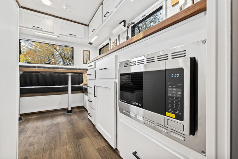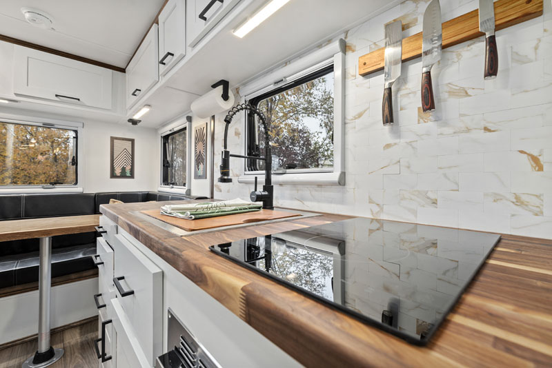 The X12 has an 80-gallon fresh tank, a 77-gallon grey tank, a 35-gallon black tank, and an on-demand diesel water heater. It can accommodate up to 1,350-amp hours of lithium and 1,200-watts of solar.