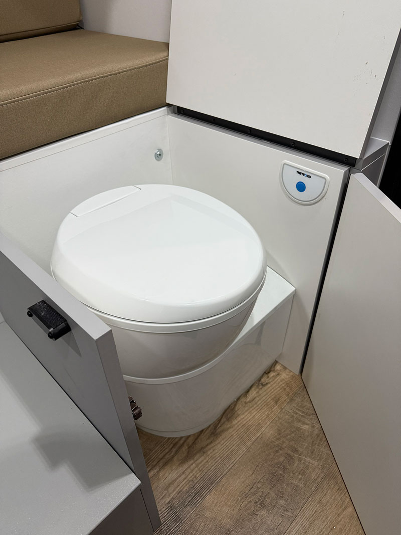 Talking to customers, they wanted a built-in cassette toilet. Our Adlar line has porta-potties, but this is a clear step-up. Our Aerie has a full wet bath with a built-in cassette. Other campers in this category have hidden cassette toilets, but we believe we have the best implementation of this feature.