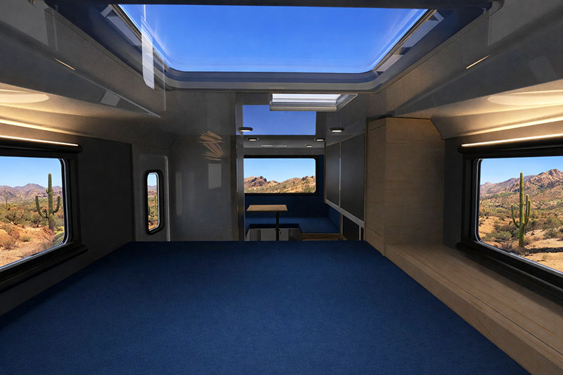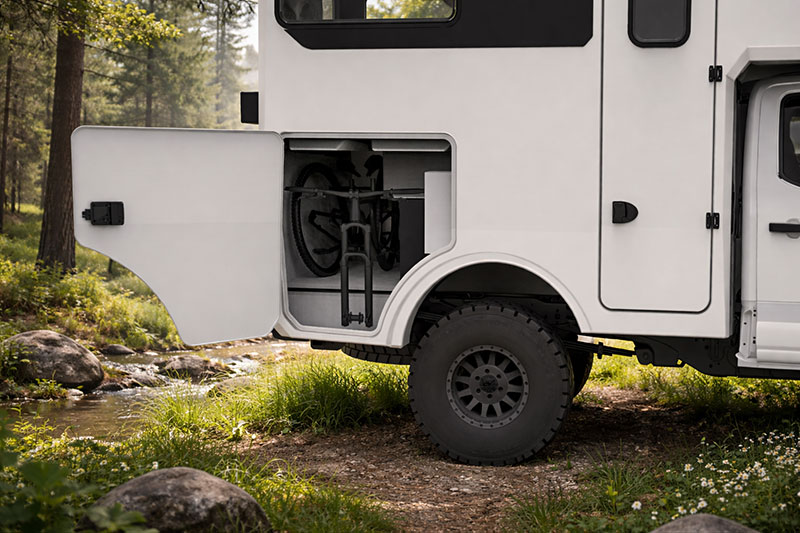 The interior will offer a seven-foot ceiling and more than 100 cubic feet of storage. The floor plan includes a north-south king bed, full cab pass-through, and a dual-access interior garage sized for full-size mountain bikes. The rear seating is designed to convert between a dinette, L-shaped couch, and full-size bed, with storage integrated throughout.