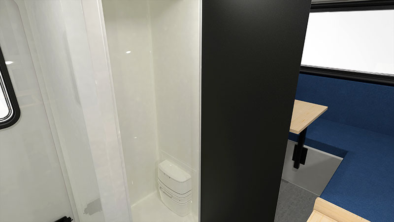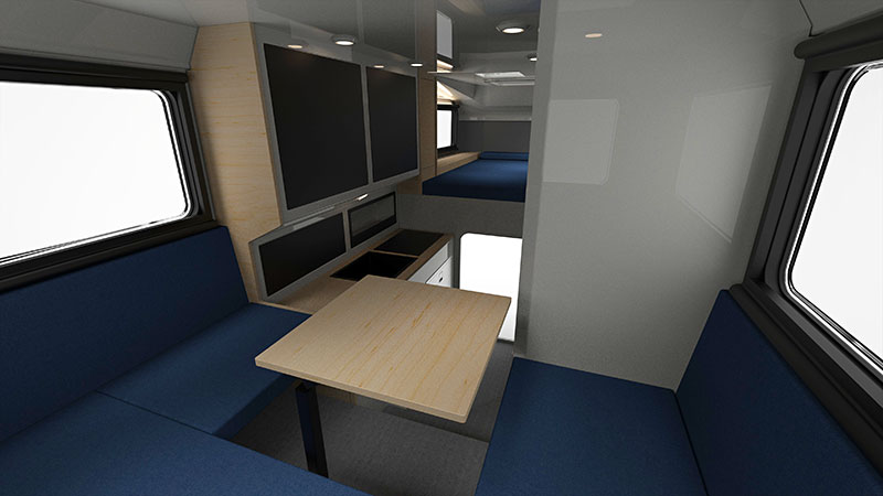 The renderings also showcase dual-pane Arctic Tern windows and two MaxxAir Deluxe roof fans for ventilation, with optional air conditioning. The projected water system includes a 40-gallon fresh tank and a 20-gallon grey tank with a gravity drain. Heat and hot water will come from a Truma Combi tied into the truck’s fuel supply.