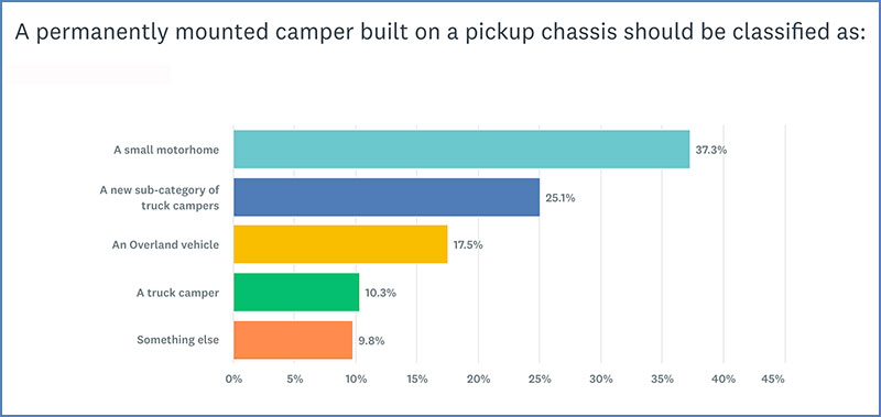 Another estimated 20 percent of respondents aligned with the traditional pickup-based definition but expressed an openness to different interpretations. That stated, they still insisted on the pickup requirement and prefer the ability to demount. This is the “We like the definition of a truck camper, but we’ll consider other ideas” camp.