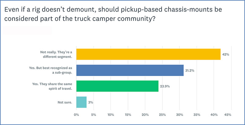 The yes votes were split between “Yes—But best recognized as a sub-group” at 31.2 percent and “Yes. They share the same spirit of travel” at 23.9 percent. Even with the stated conditions, that’s a remarkable percentage of Truck Camper Magazine readers who are open to non-demountable, chassis-mounted rigs being counted as part of the truck camper community.