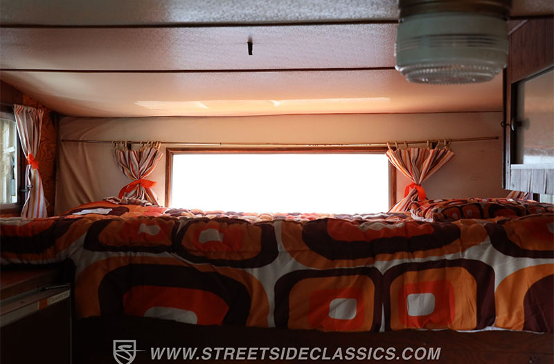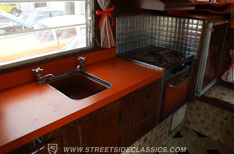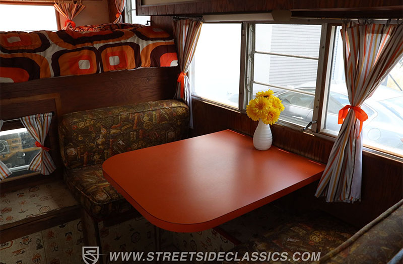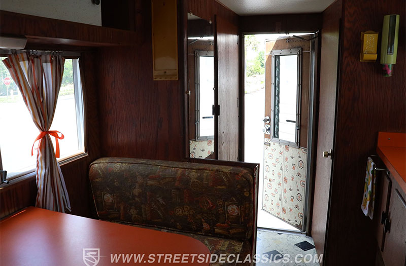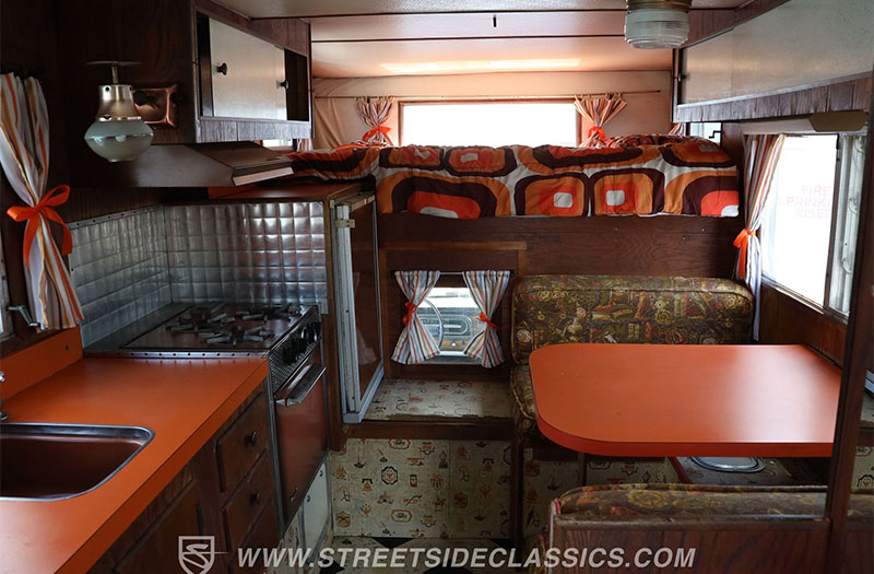 Step inside the camper and you’re greeted by peak 1970s confidence. The burnt orange countertops don’t whisper—they shout. This is the kind of fearless color choice that could only come from an era when Jimi Hendrix and David Bowie played over the radio. Add rich woodgrain cabinetry, striped curtains, polished metal surfaces, and suddenly the space feels like a roadside diner parked inside a mountain lodge. I’m willing to bet this camper has that old book smell that brings you right back to grandma’s attic.