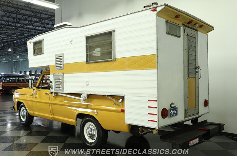 Finished in period-correct yellow with painted steel wheels and dog dish hubcaps, this truck looks like it just rolled off the Ford assembly line. Riding in the bed is a vintage camper complete with matching pinstripes, aluminum-clad siding, and a sharply tapered roofline that screams old-school cool.