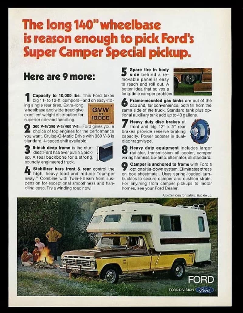 The Camper Special package was Ford’s answer to America’s booming truck camper craze. Heavy-duty suspension, upgraded cooling, camper wiring provisions, and purpose-built hauling capability made these trucks the real deal.