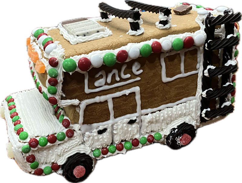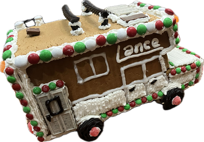 Loosely using his Chevy 3500 and Lance 1172 for inspiration, he designed, cut, and assembled a gingerbread truck and camper using white icing adhesive. With nothing more than tri-color M&M rivets, black licorice beams, and gum drop head and marker lights, his edible creation emerged. Slide-outs in, this rig is ready to ‘Go Anywhere, Camp Anywhere, and Tow Anything’.